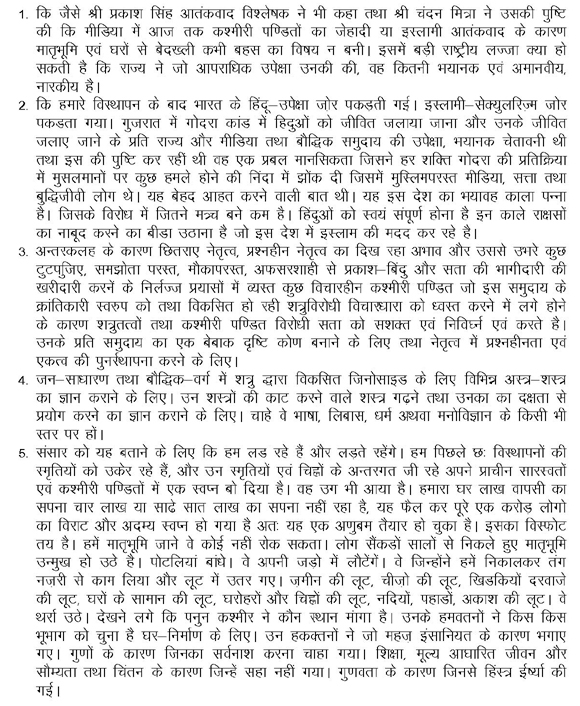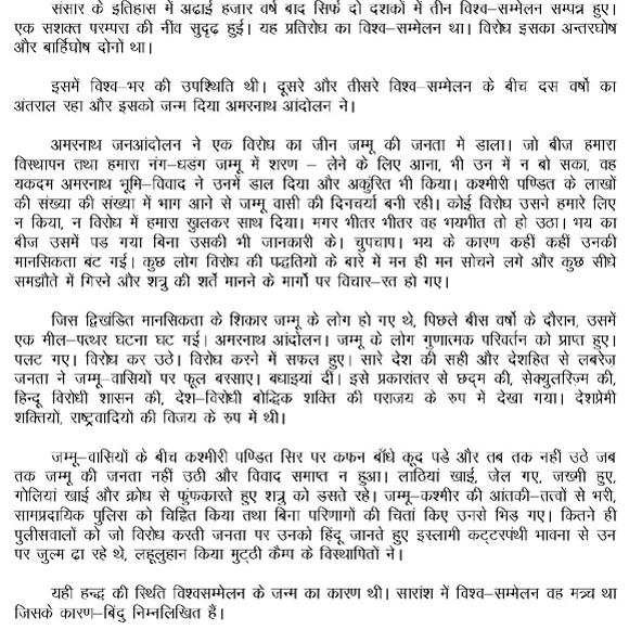 Conference. The exodus of Kashmiri Pandits who sought shelter in Jammu could not sow the seed of revolution here. The Amarnath Land issue shaped a strong movement in Jammu. The agitation launched by the Jammuites was inspiring. The seed of protest germinated. When hundreds of thousands of Kashmiri Pandits came to Jammu the routine daily life of the people of this place was in no way affected. Exodus of an entire community did not even stir them. They neither sympathized with our cause nor did they support us. There was no kind of protest from their side. But from inside they were fear-stricken. The seed of fear and uncertainty was sown in them. They were not even conscious of this state of mind. Everything happened imperceptibly and silently. This mute fear created two kinds of attitudes. Some people started thinking in terms of protests whereas others thought of making compromises and bowing before the conditions created by the enemy. This conflict and dilemma lasted for twenty years. The Amarnath Land issue was a turning point in the whole affair. There was a qualitative change in the thinking of the people. The protest flowered and the uprising succeeded. The nationalistic forces in the country showered flowers upon the protesters and congratulated them on their success. This uprising was the defeat of the pseudo- secularists, anti-Hindus and anti-national intellectuals. It was a victory of the nationalistic and patriotic forces. The Kashmiri Pandits plunged into this agitation fearlessly from its inception. Their participation showed their conviction. They supported this cause till the end. They faced lathis and went to the prisons. They received bullets and were injured. But with rage and anger they bit the enemy having militant bent of mind. They fought the state police tooth and nail without caring for the results. The refugees living in the Muthi Refugee Camps fought the police bravely who treated them as outsiders who had come from Kashmir. The Third World Conference of the Kashmiri Pandits emerged out of this confrontation. The important points that came out of the Conference are :-