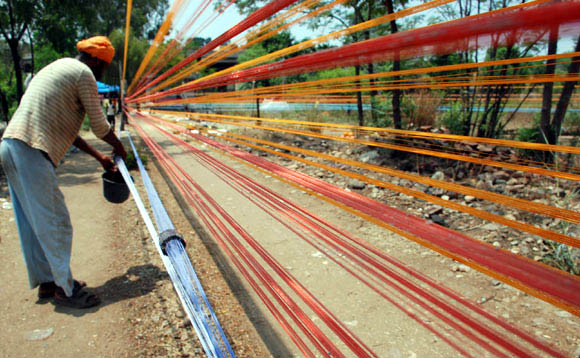 11, 2009 Jammu: Workers prepare kite threads on the side of a road in