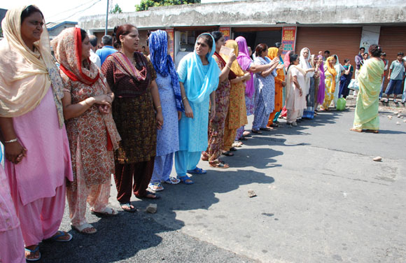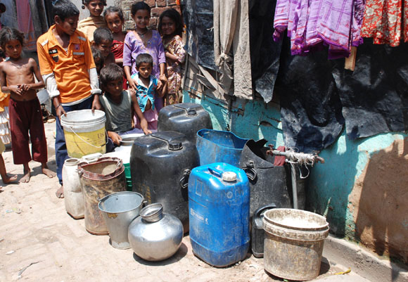 16, 2009 Jammu: Children’s wait in queue with their water pots to