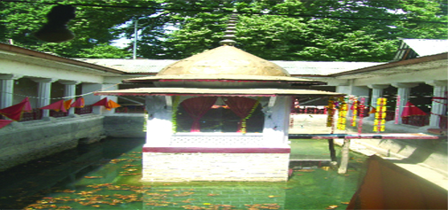 Devibal, popularly known as Shailputri or Shaila Devi, is located on the left bank of Vitasta on the National Highway, just 1 km from Baramulla on Baramulla-Uri road at Anapur (present day Khanpur). The shrine is nearly 1000 years old which can be testified from the remains found at the site, placed on the left side under a big Chinar inside main entrance of the shrine. These are six in number and include a unique Shiv Lingam. The main entrance of the shrine is close to the road. One has to step down eight stairs by using staircase to reach the temple premises laid with dressed stones. This beautiful temple is surrounded by four mighty Chinar trees. There are two walnut and 15 popular trees in the premises of this temple comprising about seven kanals of land. One has to turn right after walking eight yards to reach the main entrance of the sanctum sanctorum and then there is ascend of seven steps to enter. Within the premises is a holy spring, inside which stands a marble temple like the one at Ksheer Bhawani, with a marble icon of Mother Shailputri facing towards south. The premise is 105 feet long and 47 feet wide and has space for circumbulating (Parikrama), with the floor laid with marbles, around it. Holy spring is sixty feet in length and twenty feet in width having crystal clear waters? Water oozes on the right hand side top corner of the holy spring. Kashmiri Pandits hold this Ashthapan in high esteem and consider it next to Ksheer Bhawani. One has to step down seven steps to reach Vitasta Ghat. There is one Dharamshala within the temple premises. Security forces are occupying this Dharamshala at present.