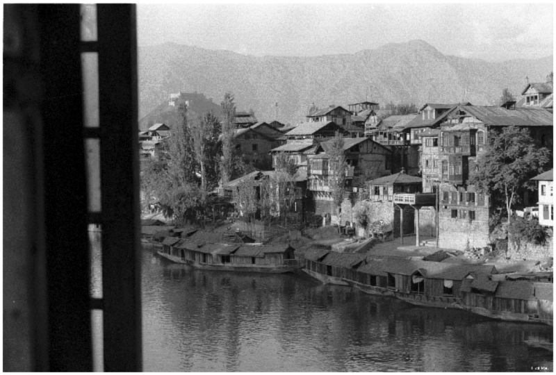 Bhana-Mohalla side seen from Habba-Kadal with Hari-Parbat Forte in the background. The small lower house with the saddle roof (on the right with Wurusi- pat windows) was a shrine/temple where, I still remember a huge cry that Bhagwati had appeared (in early 70’s) |