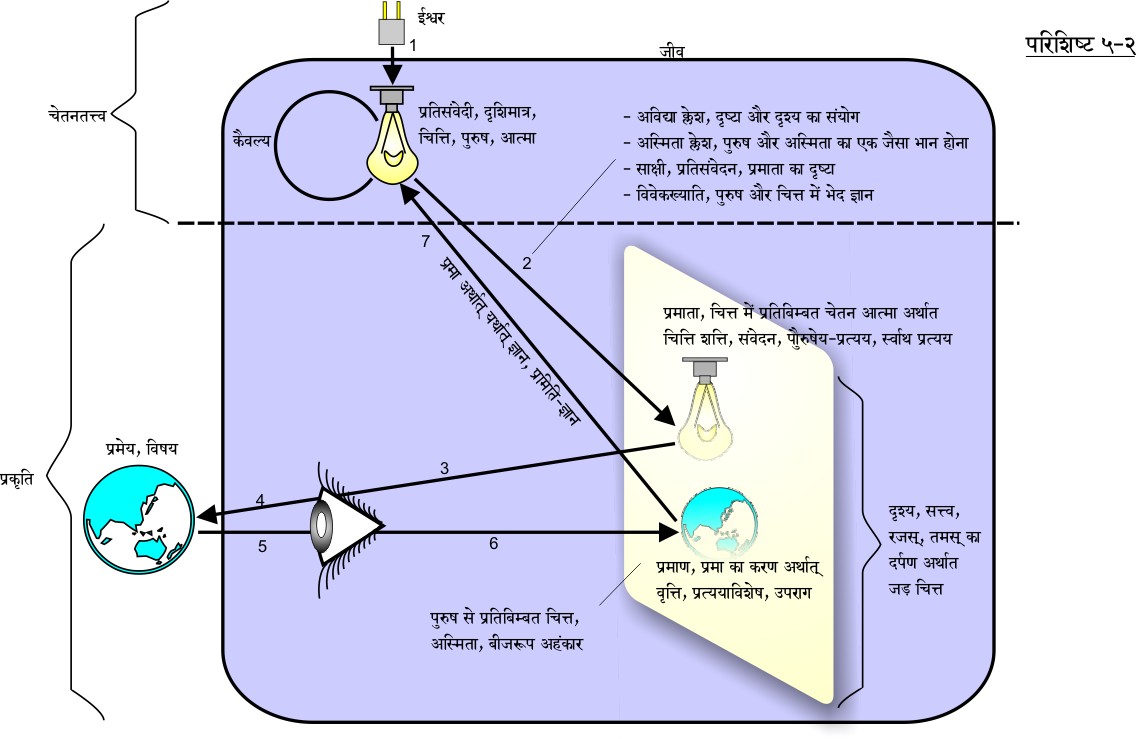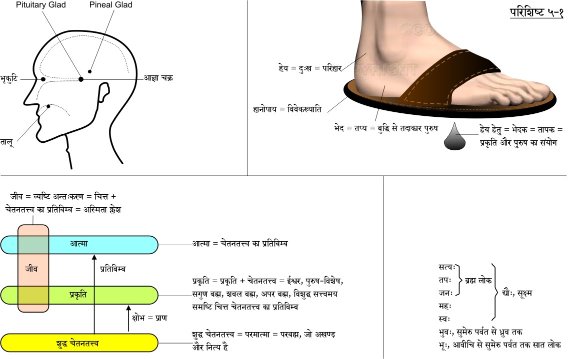 Q. What should be eradicated? A. Pain, which is due in the future. Q. What is the source of pain? A. Consciousness and matter’s union, which is based upon wrong-knowledge (Avidya), where consciousness gets identified with matter. Q. What is that state, where there is no pain? A. Having no wrong-knowledge. Q. How to achieve the above state? A. Through right-knowledge (Vivek-Khyati) i.e. consciousness is separate from matter.
