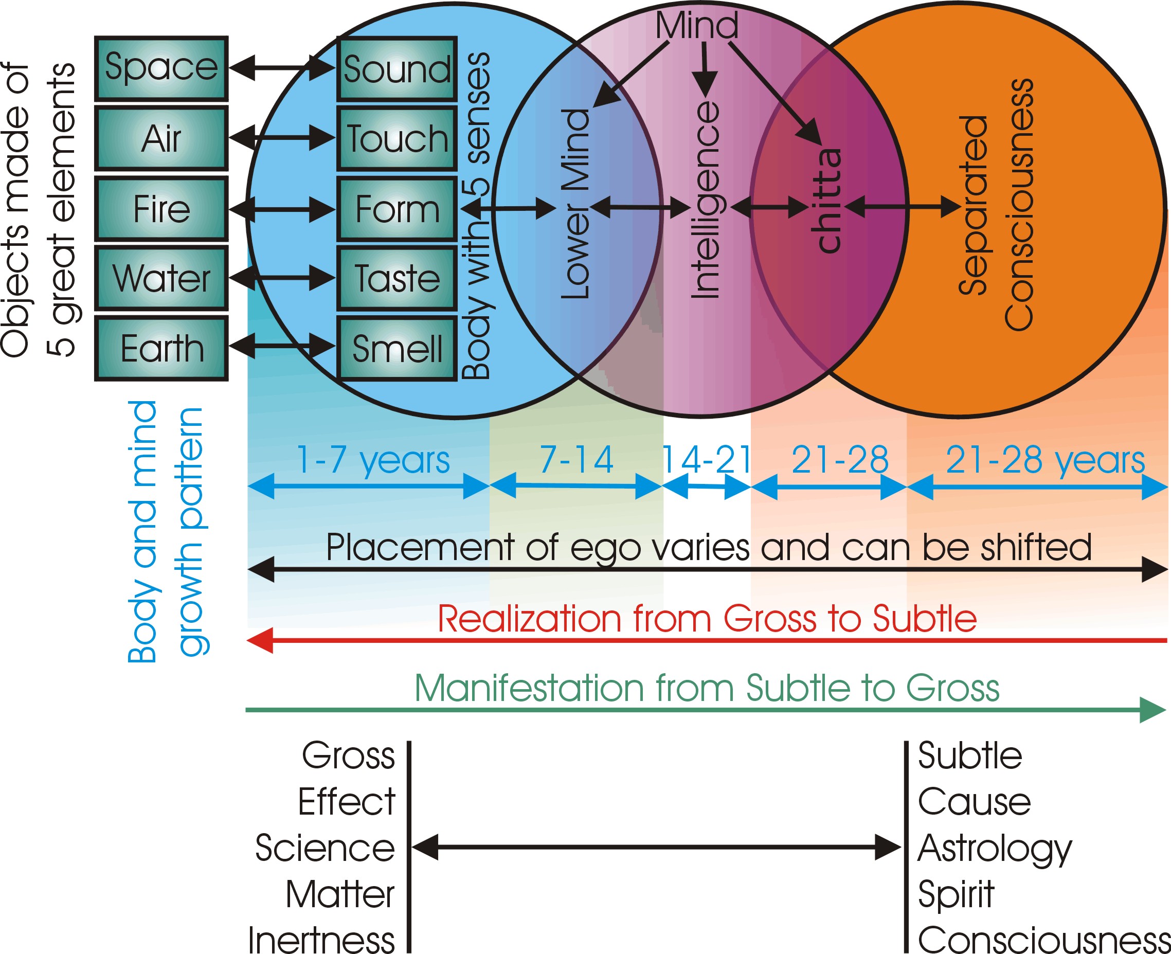 Body and Separated Consciousness are two extreme, but complimentary (not opposite) ends, and mind lies in between. Depending upon our will and past Samskara, ego can be placed at either end. A materialistic and spiritual person will keep his ego at body and Chitta respectively. While doing creative work, Scientists and artists, keeps their ego is at Chitta, which is different from spiritualism because still the energy is being used on external material world. Energy has a tendency to drain out through five senses. If we try to block out one channel, water flows to rest of the available channels. That’s why blind people possess extra-ordinary smelling and hearing powers. Ever since only a small percentage of mind is used on the external material world and therefore mind has become atrophied. Mind is thought, and thought is time. No thought means no-mind and thus timelessness, which leads to an experience beyond five senses. For example deep sleep experience is without mind and senses. From material angle, spiritualism is irrational teaching to a rational mind. Our knowledge (base of the logic) is based upon five imperfect senses and relativity. Thus spiritualism is beyond five senses and logic. From spiritual perspective, spiritualism is rational teaching to an irrational mind.