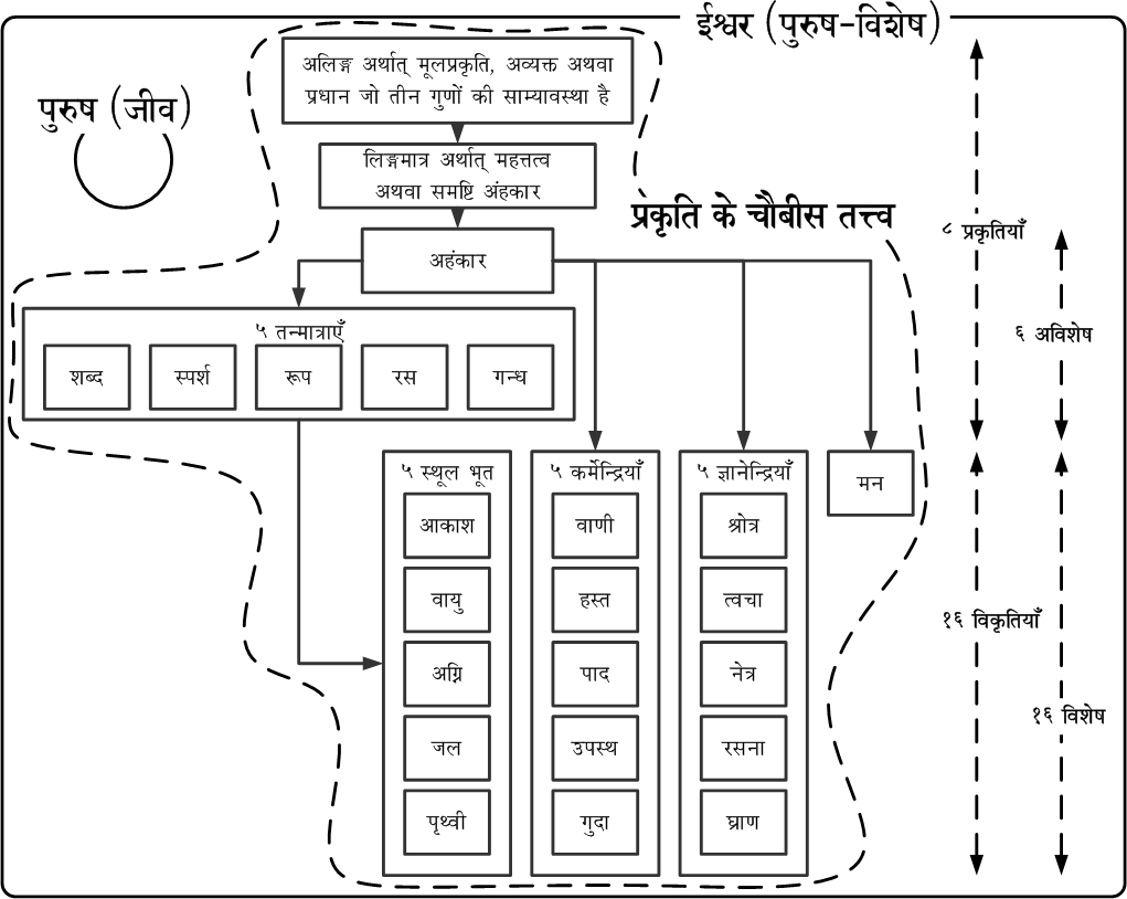 one, beyond, infinite, omnipresent, omniscient, owner and controller. Process of unfolding or emulsion (consciousness and matter) starts when dormant-ego becomes active, which with the help of wrong-knowledge metaphorically demarcates a fraction from the Whole. This gives rise to “I” and “Mine”, which tries to expand in a wrong direction i.e. externally, to complete itself. From Whole, the apparent-fragmentation, inherits the ability to-know, to-desire and to-act. “Knowledge” in apparent-fragmentation creates incompleteness and “desire” to attain, which finally leads to “act” to complete the incompleteness. Since this incompleteness can never be completed externally, the know/desire/act vicious circle never comes to an end. At the same time, the experience after an “act” gets categorized as good or bad. A good and bad experience defines likes and dislikes pattern, which gives happiness or sadness respectively. Then apparent-fragmentation tries to ensure that likes should be repeated and dislikes should be avoided at all cost. Any obstruction on the way is dealt with anger and violence. Anger and violence further leads to misery. Happiness is less sadness and sadness is less happiness. Happiness emerges, stays and merges back on the substratum of sadness and vice versa. Happiness and sadness are two sides of the same coin. Happiness and sadness are distorted and impure version of bliss and non-bliss respectively. In fact to attain pleasure or happiness, one has to go through the series of pain such as efforts involved in attainment of an object, safeguard the attained object, pain after the object life cycle is over and violence involved in the above process. Therefore apparent happiness is sadness. Apparent-fragmentation infected by ego, directly or indirectly, tries to attain eternal existence, consciousness and bliss externally, which is not possible, because they all belong to Whole. When this is understood fully, then the process of folding back starts - ego becomes dormant and it merges back in the Whole, which is pure existence, consciousness and bliss.